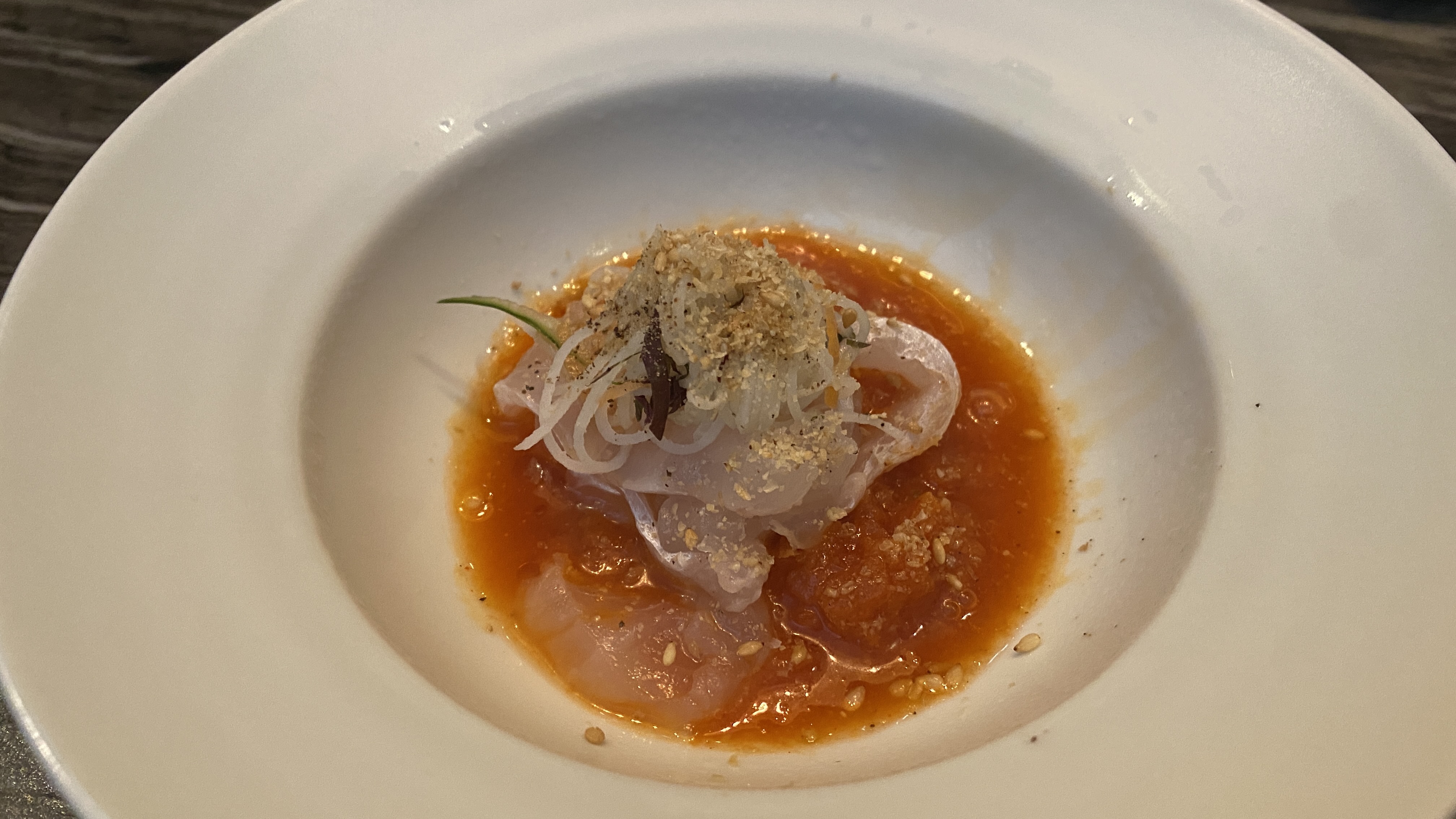 약간...차돌양지 수비드한걸 얇게 저며준것같은 고기...?그런 촉촉한 고기였고 위에 올라간 것도 허브의 한 종류라고 알려주셨는데 이름을 까목...ㅎ보라색만 허브인줄 알았는데 초록색도 허브 종류라고 하셨다.